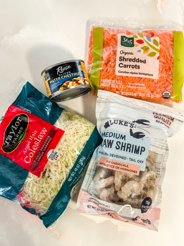 Shredded cabbage & shredded carrots – make up the veggie “slaw” base that mimics the inside of an egg roll.